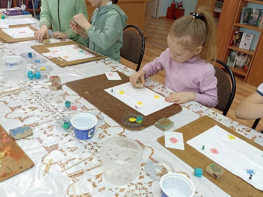 Дети от 7 до 12 лет наносили орнаменты на белых платках акриловыми красками.