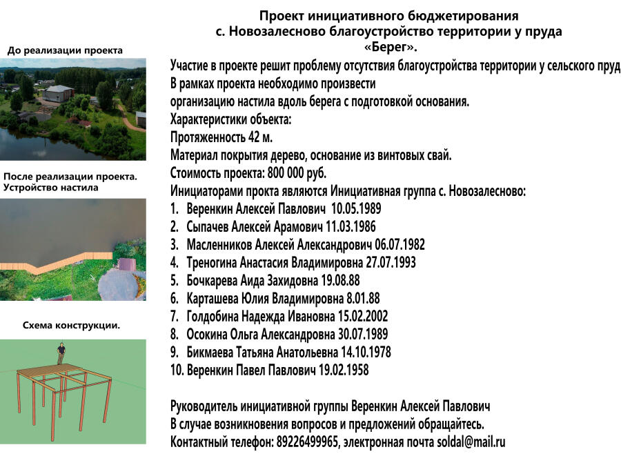 Проект "Берег" это часть большого комплекса связанных мероприятий и проектов в селе Новозалесново. Набережная Новозалесновского пруда это комплекс благоустройства для проведения множества событий в жизни села. Наша цель не создание отельного объекта, а включение его в жизнь села и придание ему многозадачности. Объеденив усилия жителей, ТОС "Родник", АНО "Центр реализации проектов "Территория урала" и бизнеса Осинского округа, мы реализовали этот проект. Настил вдоль берега стал площадкой для проведения брендового мероприятия села "Заплыв на самодельных плавательных средствах", который в 2025 году поставил неофициальный рекорд России по числу участников и вышел на уровень краевого мероприятия. Так же настил является продолжением ансамбля благоустройства в Новозалесново который включает в себя реализованные проекты по Инициативному бюджетированию в 2024 году "Тротуар безопасности", муниципальная программа в 2025 году "Строительство моста", а так же начавшаяся реализация проекта инициативного бюджетирования "Свет памяти" по установке Вечного огня и проект по программе самооблажения граждан "Освещение".